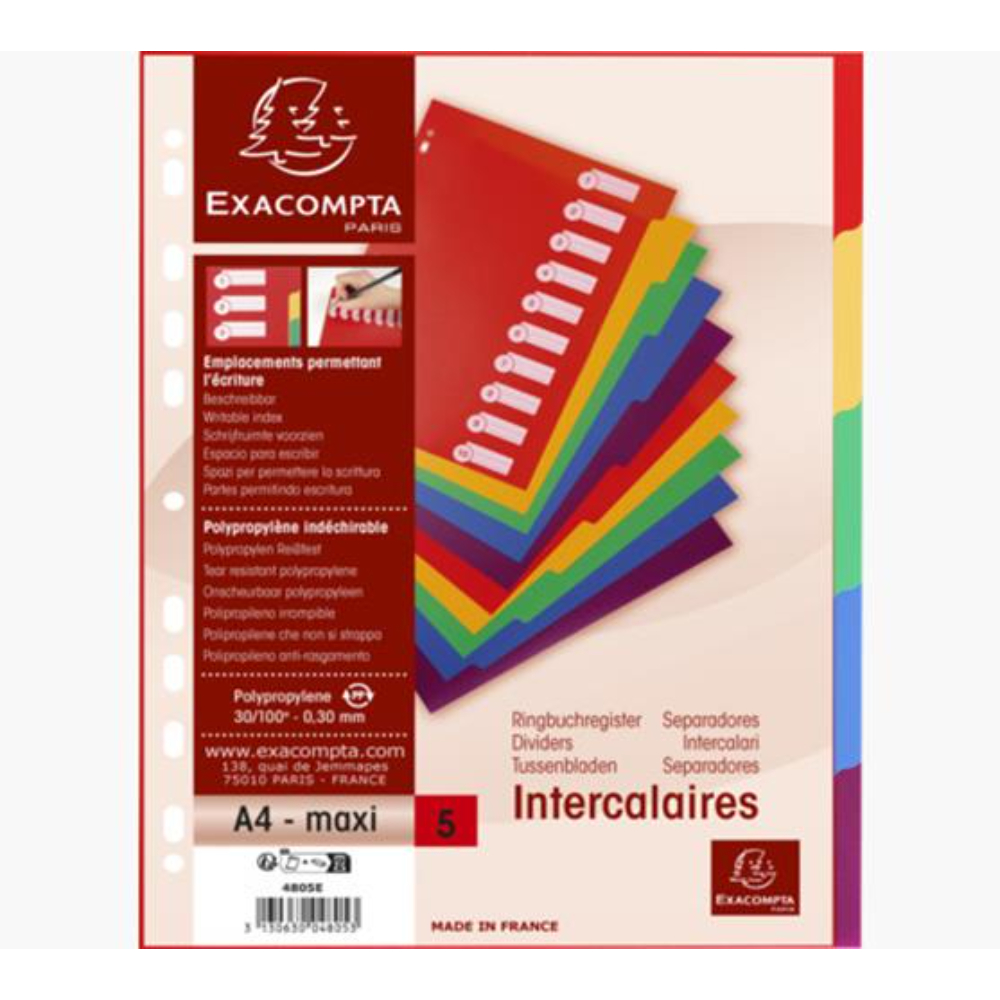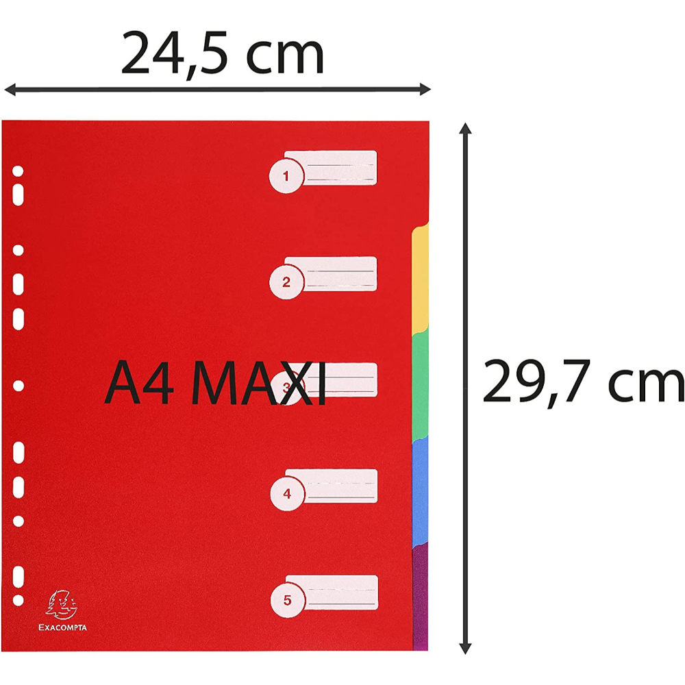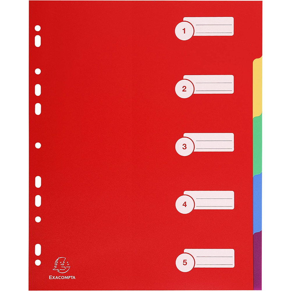 These Exacompta A4+-sized index file dividers are ideal for home, office, and professional use. The set of 5 dividers is colour-coded, comes in maxi A4+ size, and is pre-punched so it can be inserted into most files and folders with multi-punched pockets.