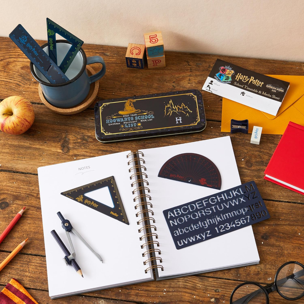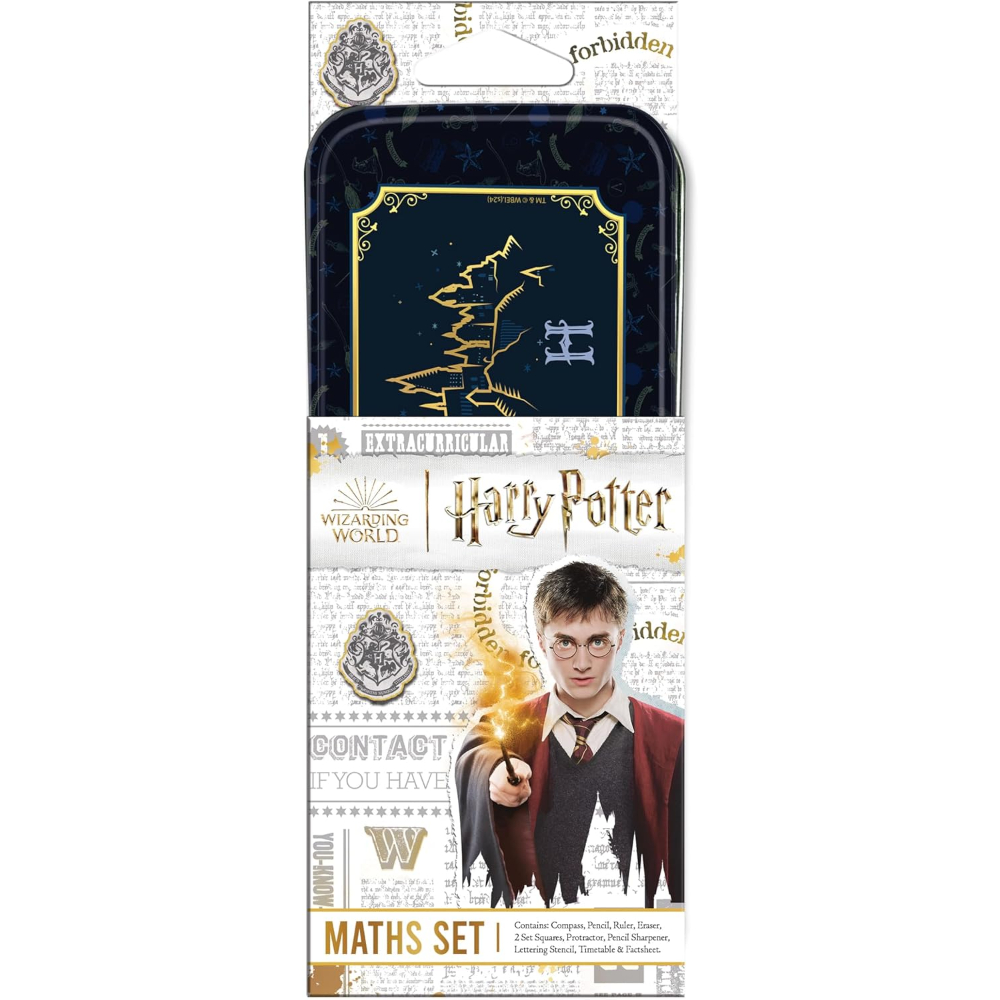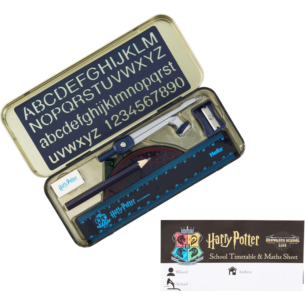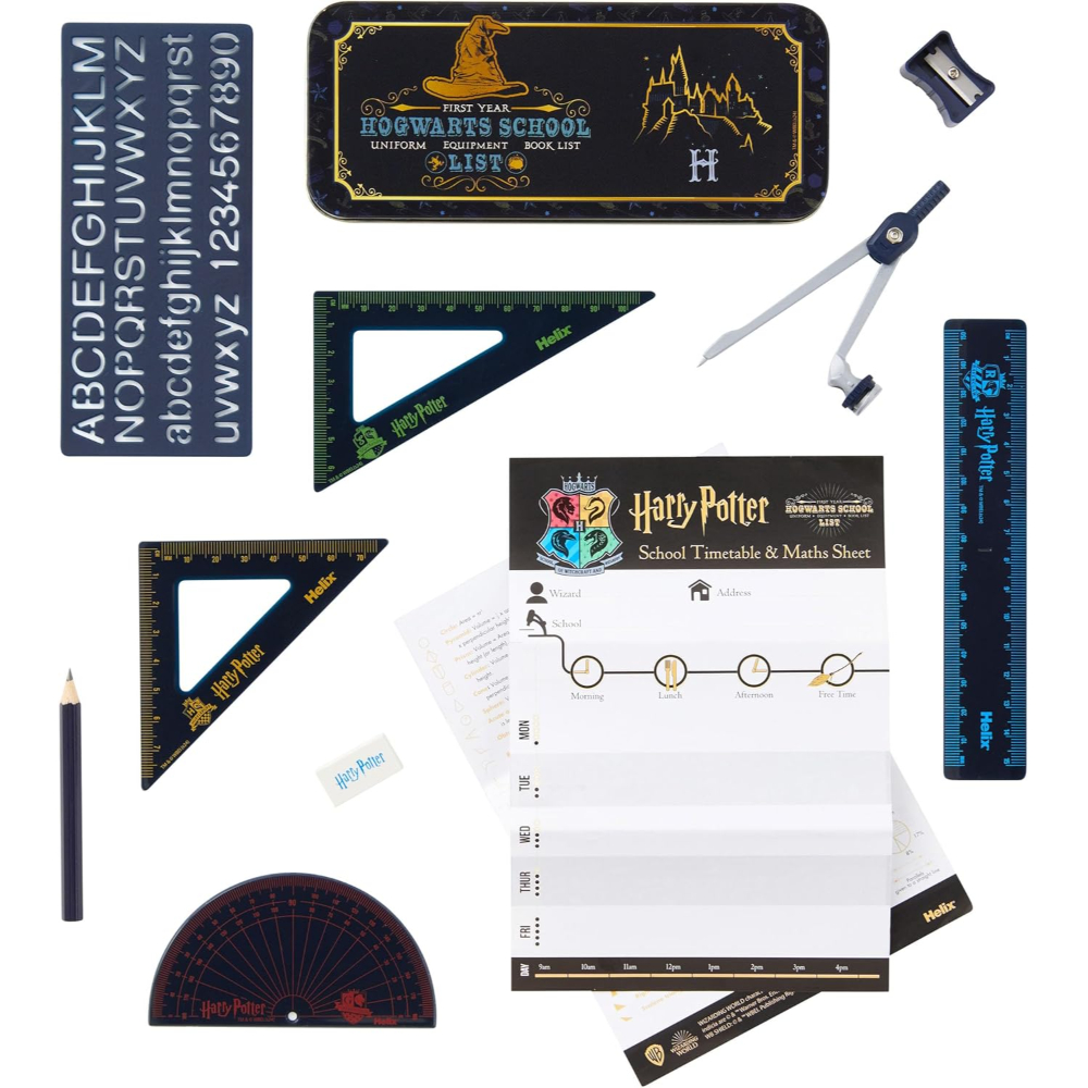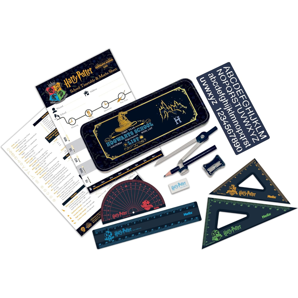 - Contents include: metal self-centring Compass, 15cm/6” Ruler, Pencil, Eraser, 45° and 60° Set squares, 180° Protractor, Pencil Sharpener, 10mm Lettering Stencil, and a Harry Potter themed School Timetable & Maths Fact Sheet