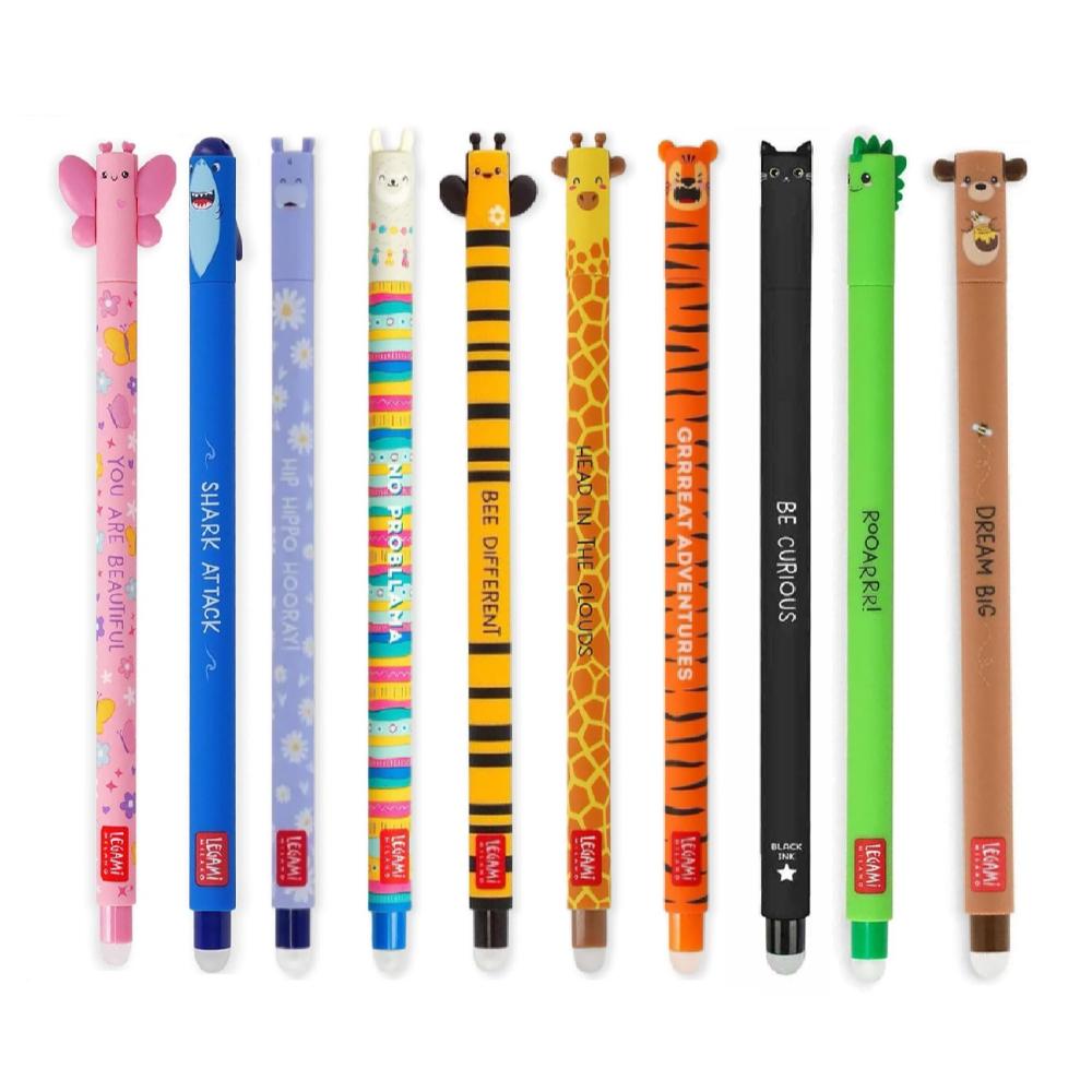 LEGAMI Set of 10 Gel Erasable Pens 0.7 mm Tip – Bee, Butterfly, Cat, Dino, Giraffe, Hippo, Llama, Shark, Teddy Bear, Tiger