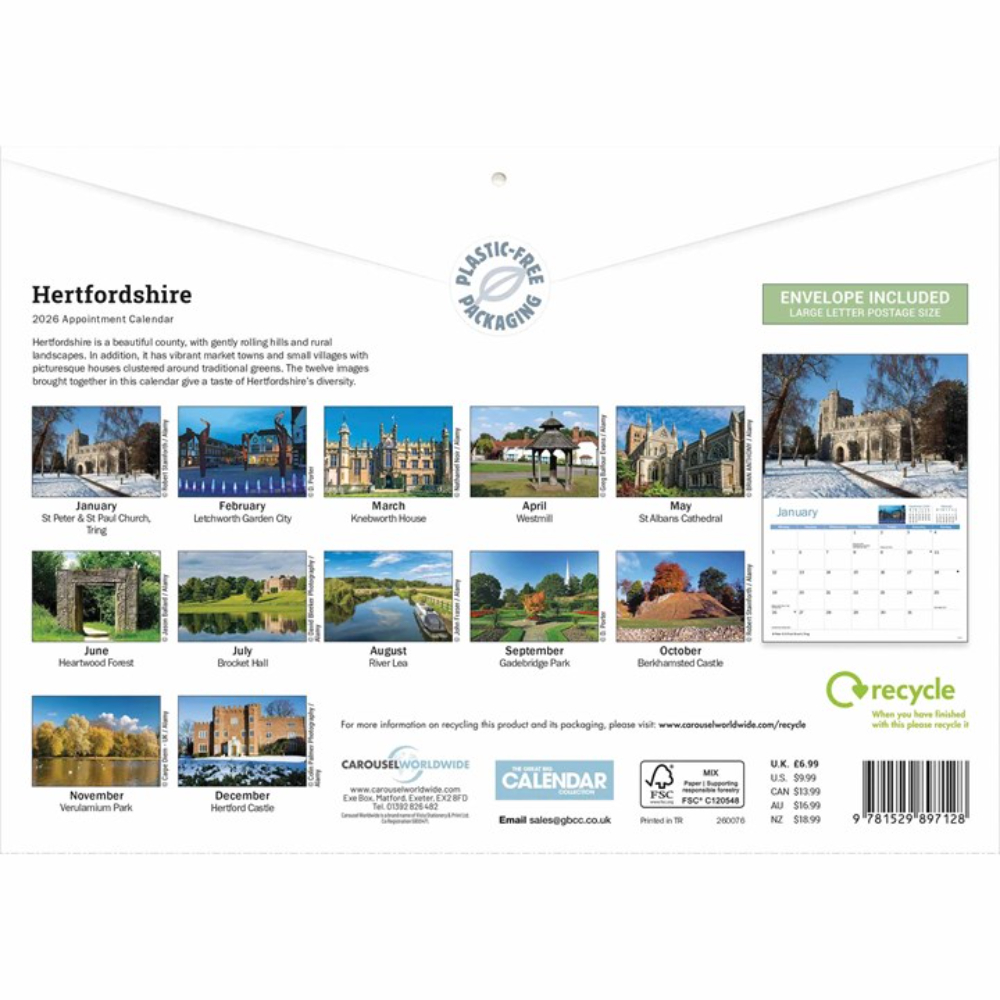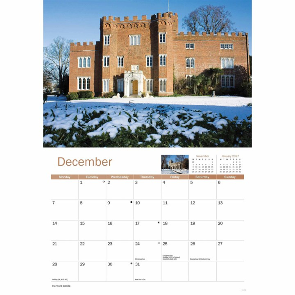 The county of Hertfordshire has plenty to offer! With gently rolling hills and rural landscapes, it easily lets you forget how close to the bustling city of London it is. Stunning stately homes and beautiful churches are featured in the Otter House Hertfordshire A4 Calendar for 2026, including magnificent St Albans Cathedral and Knebworth House.