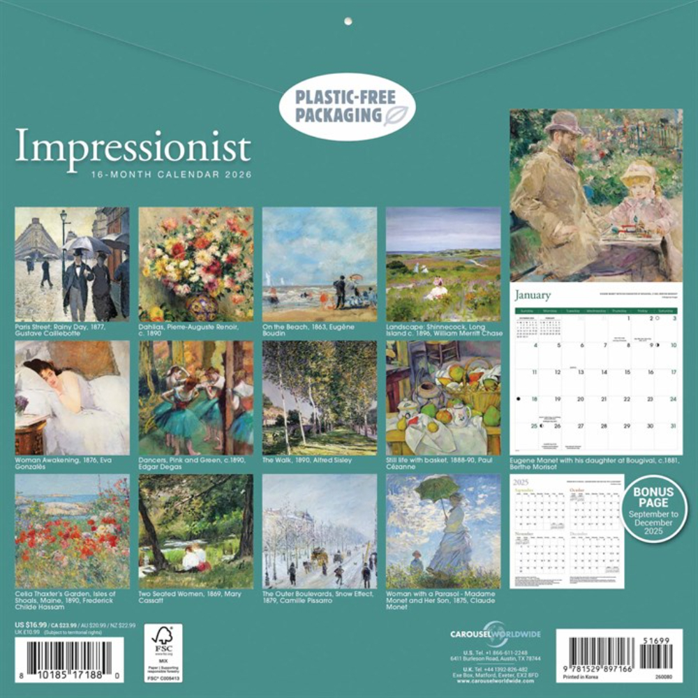 Featuring artwork from some of the most famous artists of their time, the Otter House Impressionist Calendar for 2026 is a wonderful way to enjoy these beautiful paintings. This is a Sunday starting 16 month calendar, with a bonus page for September to December 2025.
